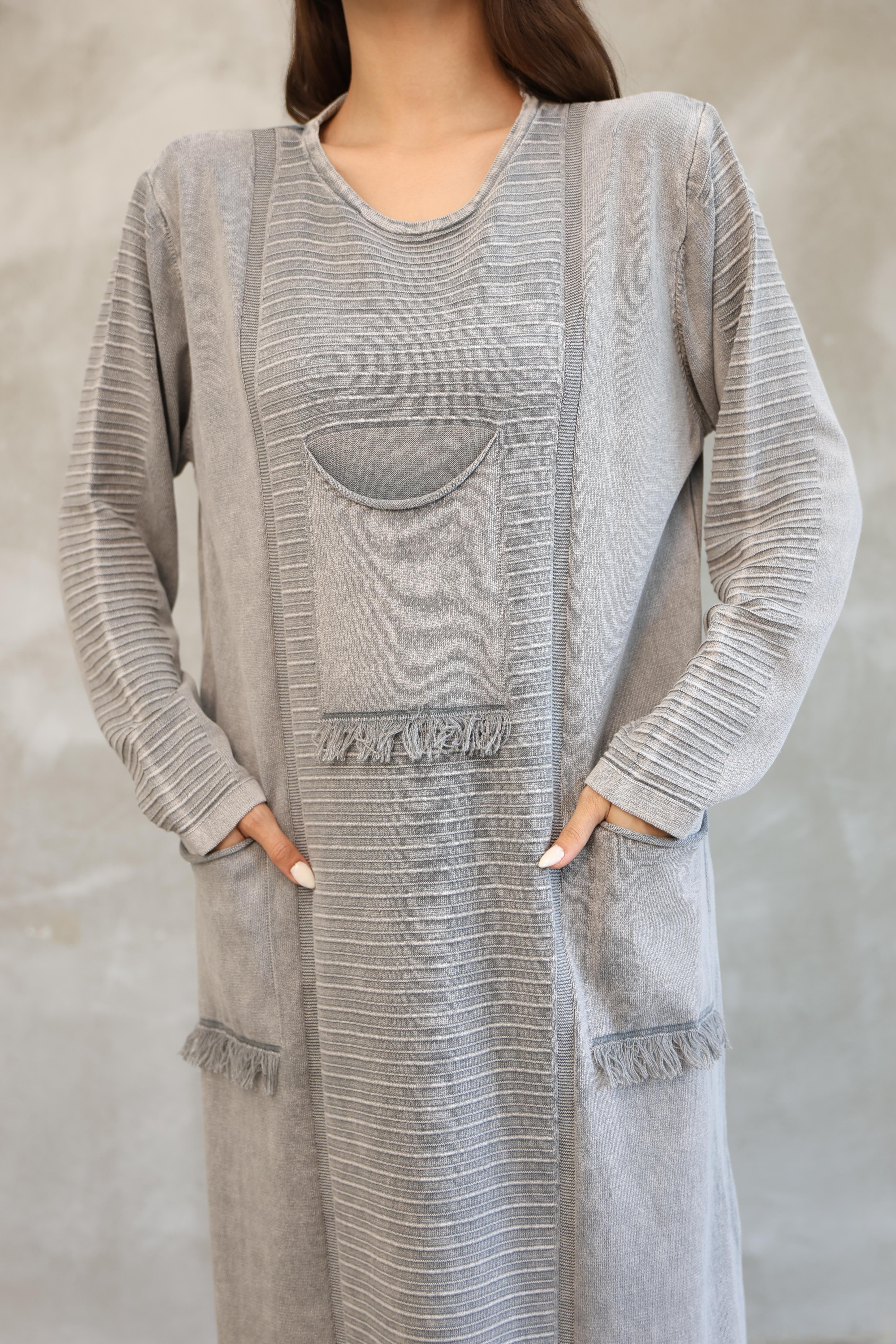 Kadın %100 Pamuk Önden Cepli Triko Elbise -Gri