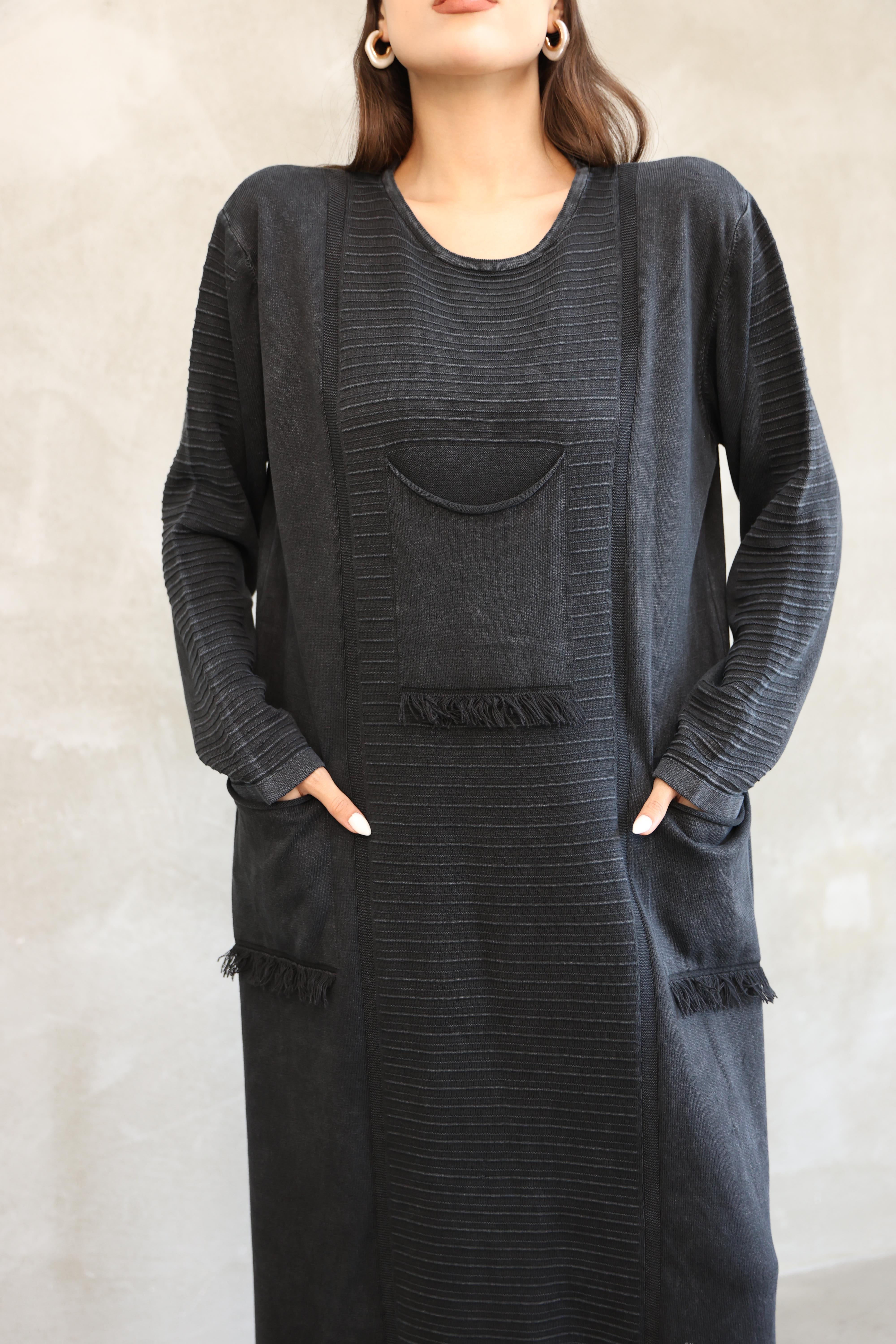 Kadın %100 Pamuk Önden Cepli Triko Elbise -Siyah (Q218)