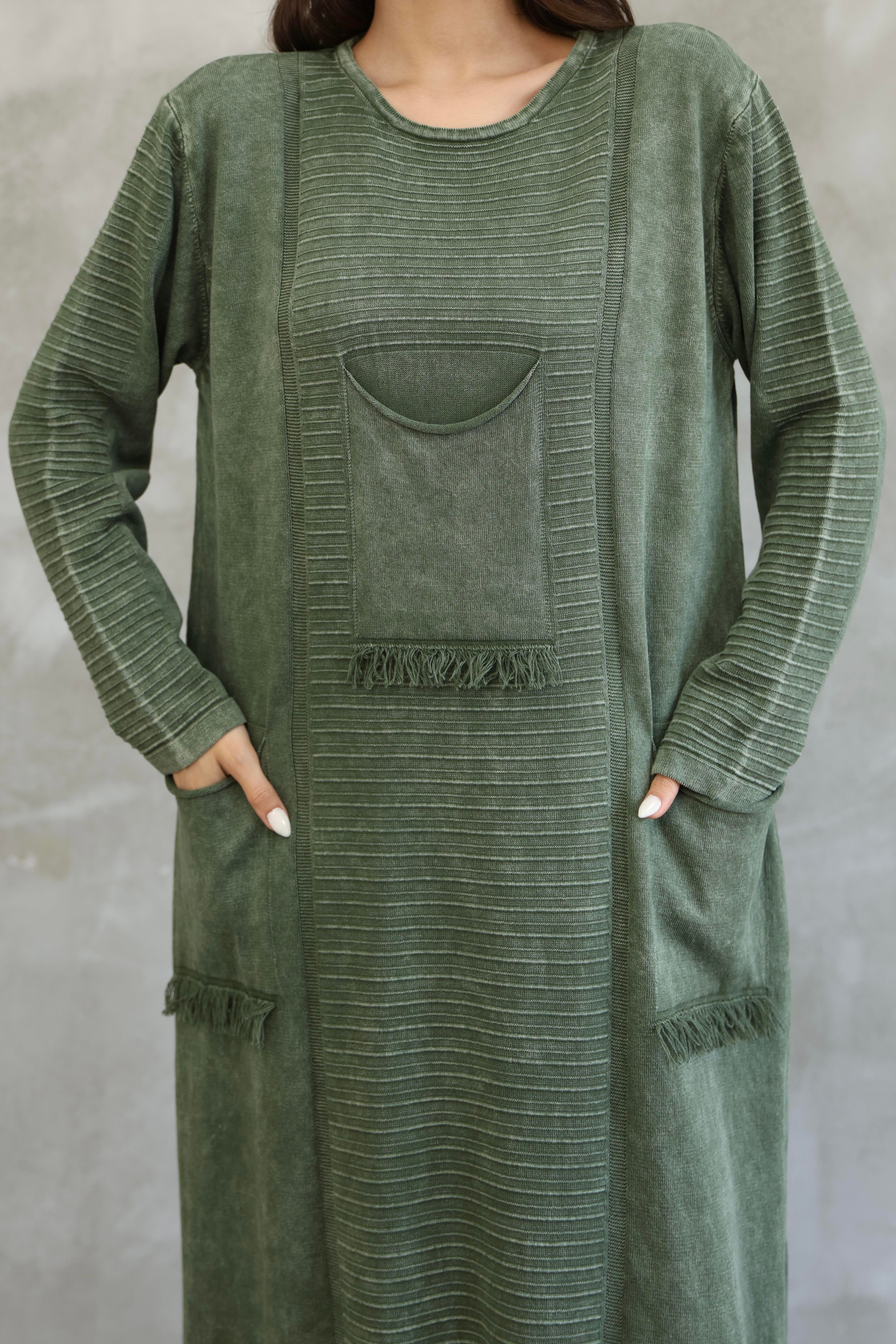 Kadın %100 Pamuk Önden Cepli Triko Elbise -Yeşil