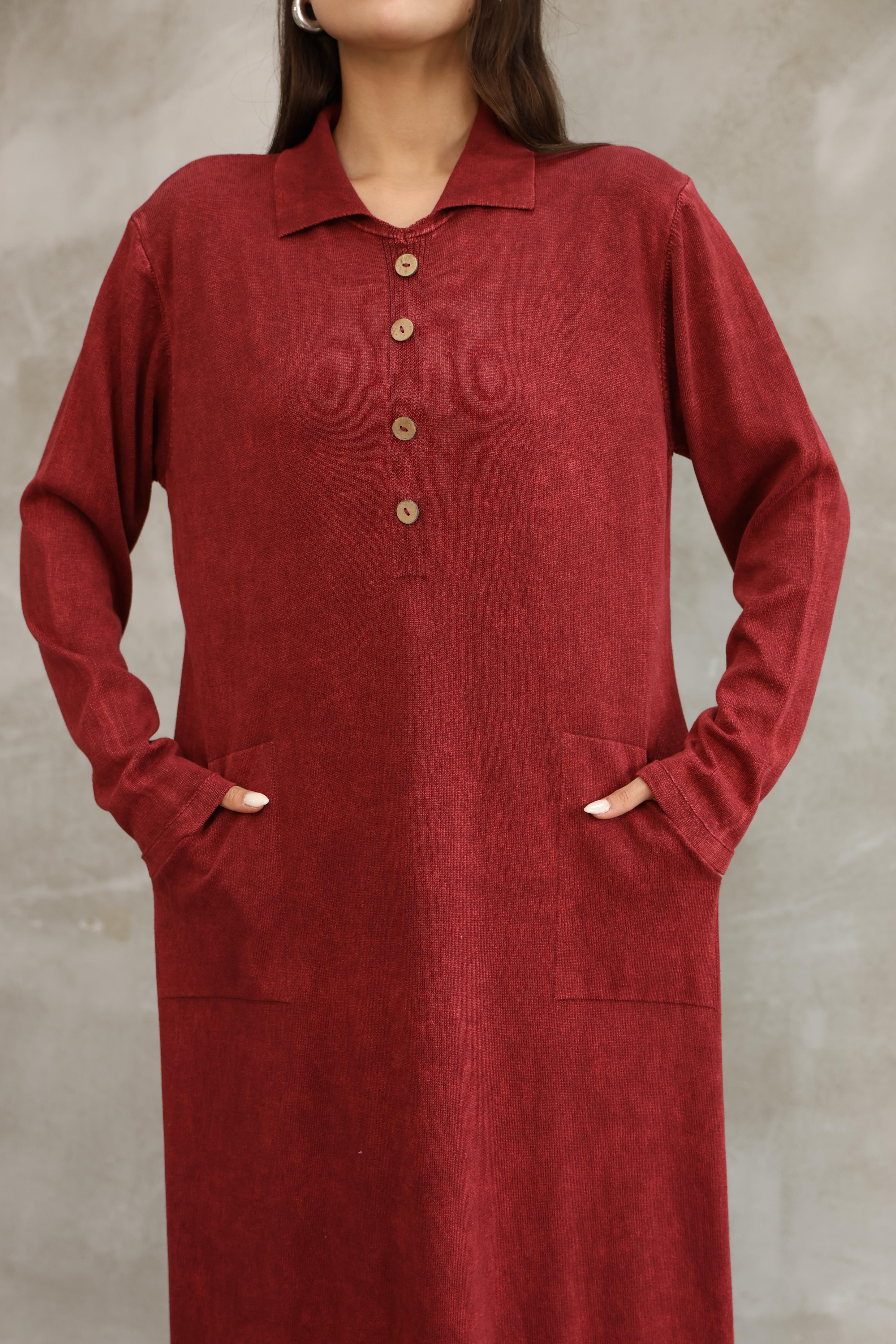 Kadın % 100 Pamuk Yakalı Elbise-Bordo (Q219)