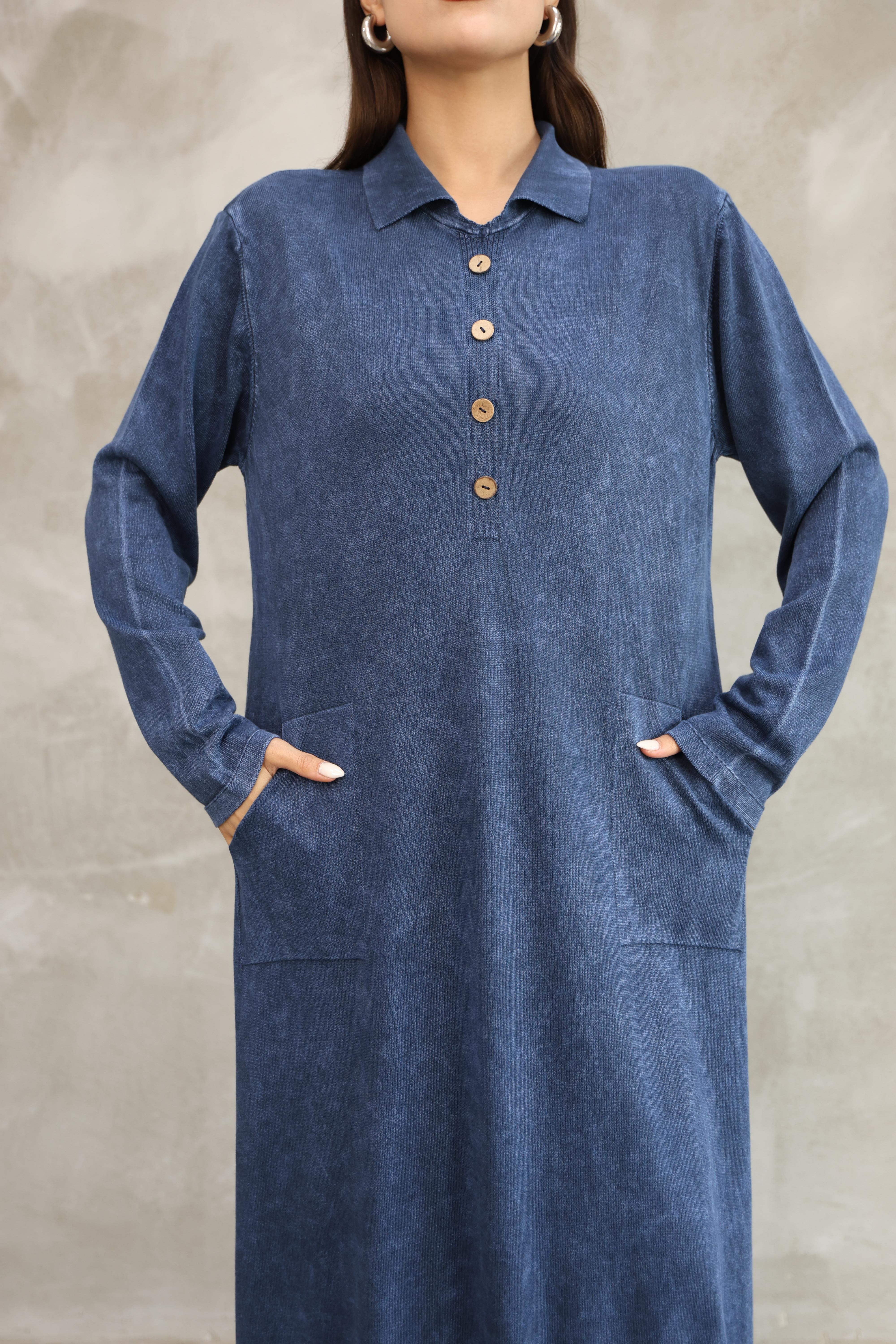 Kadın % 100 Pamuk Yakalı Elbise-Mavi (Q219)