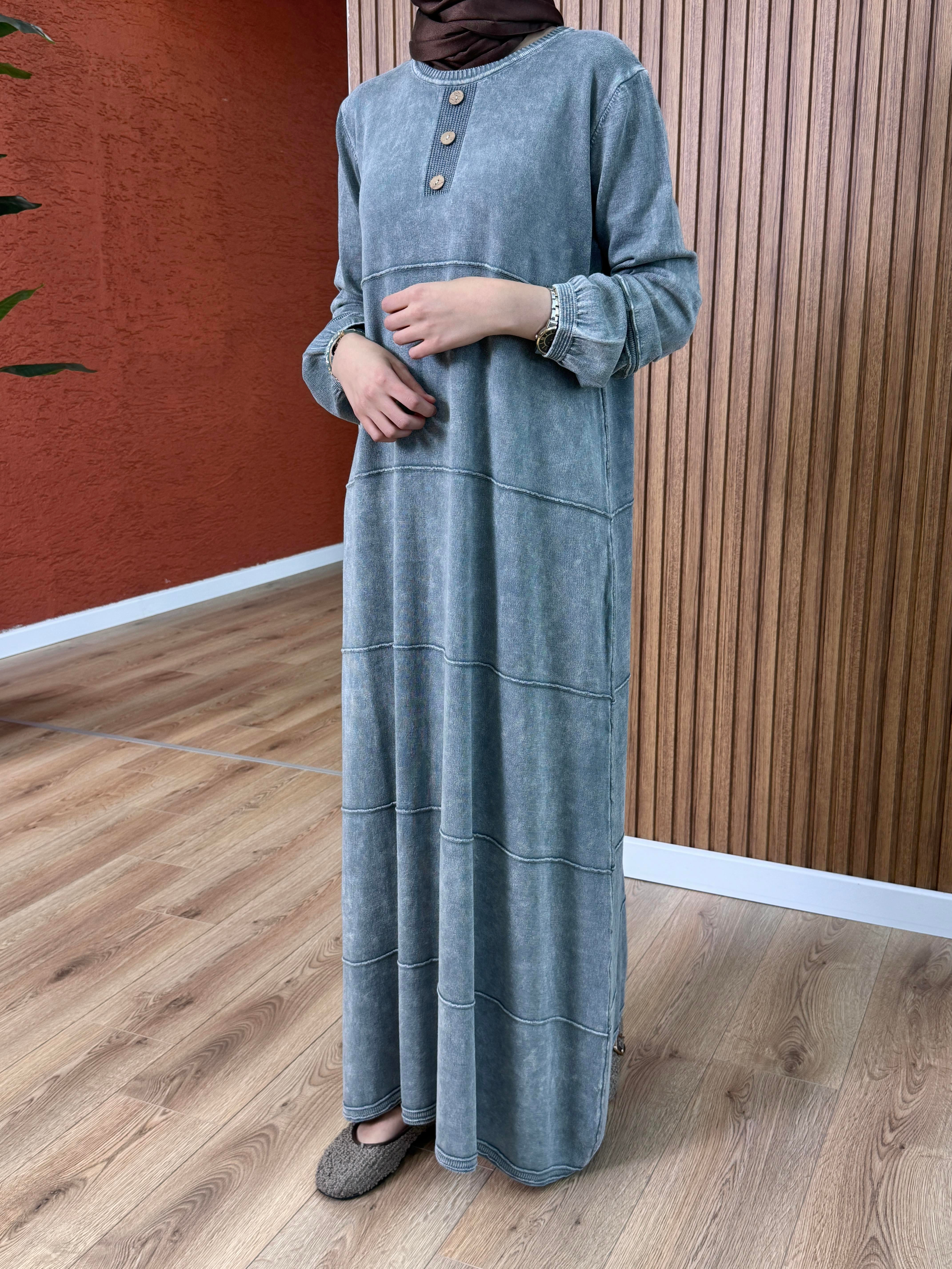 Kadın % 100 Pamuk Yakası Düğme Detay Elbise-Gri (Q212)