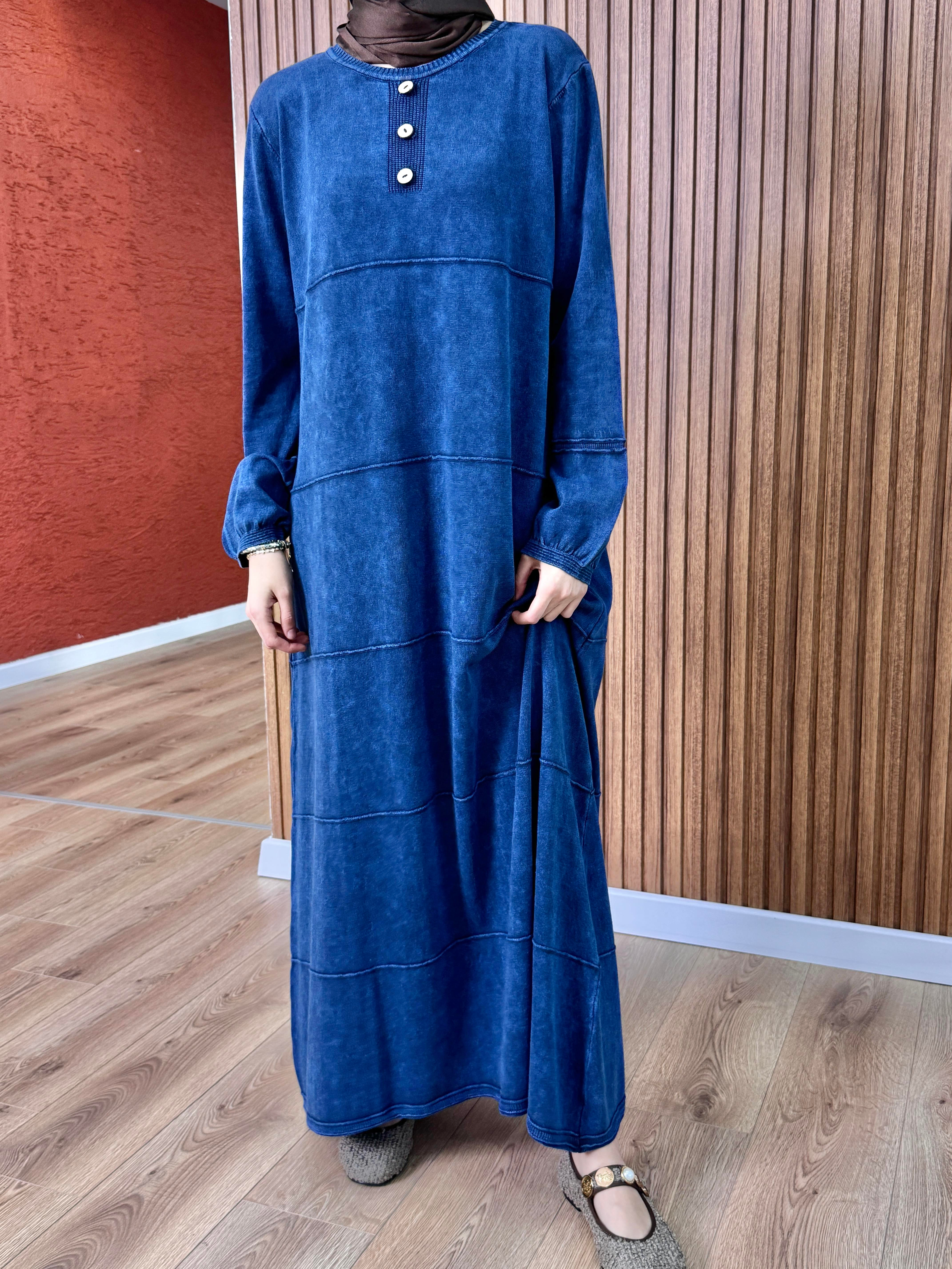 Kadın % 100 Pamuk Yakası Düğme Detay Elbise-Mavi (Q212)