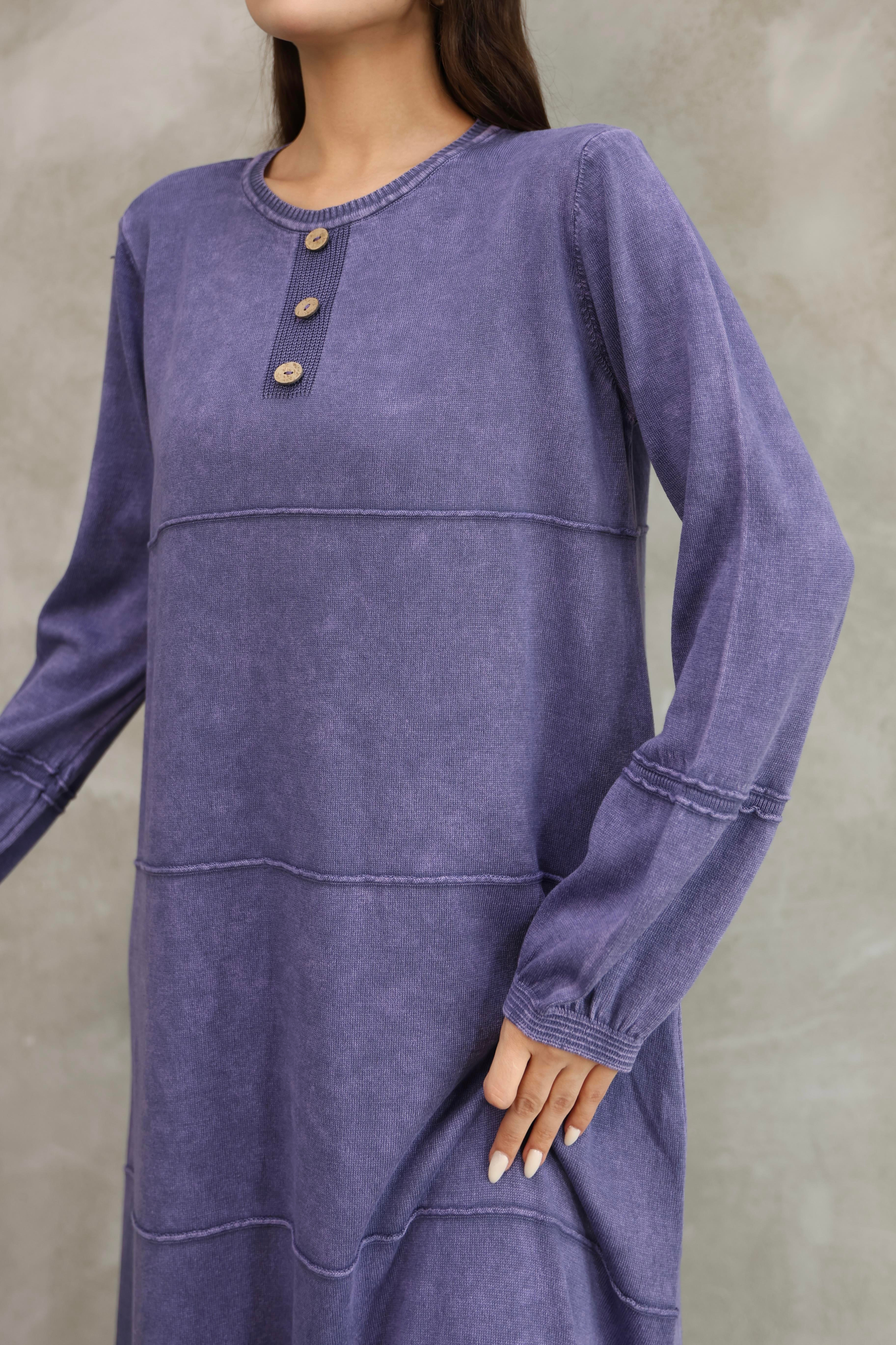 Kadın % 100 Pamuk Yakası Düğme Detay Elbise-Mor (Q212)