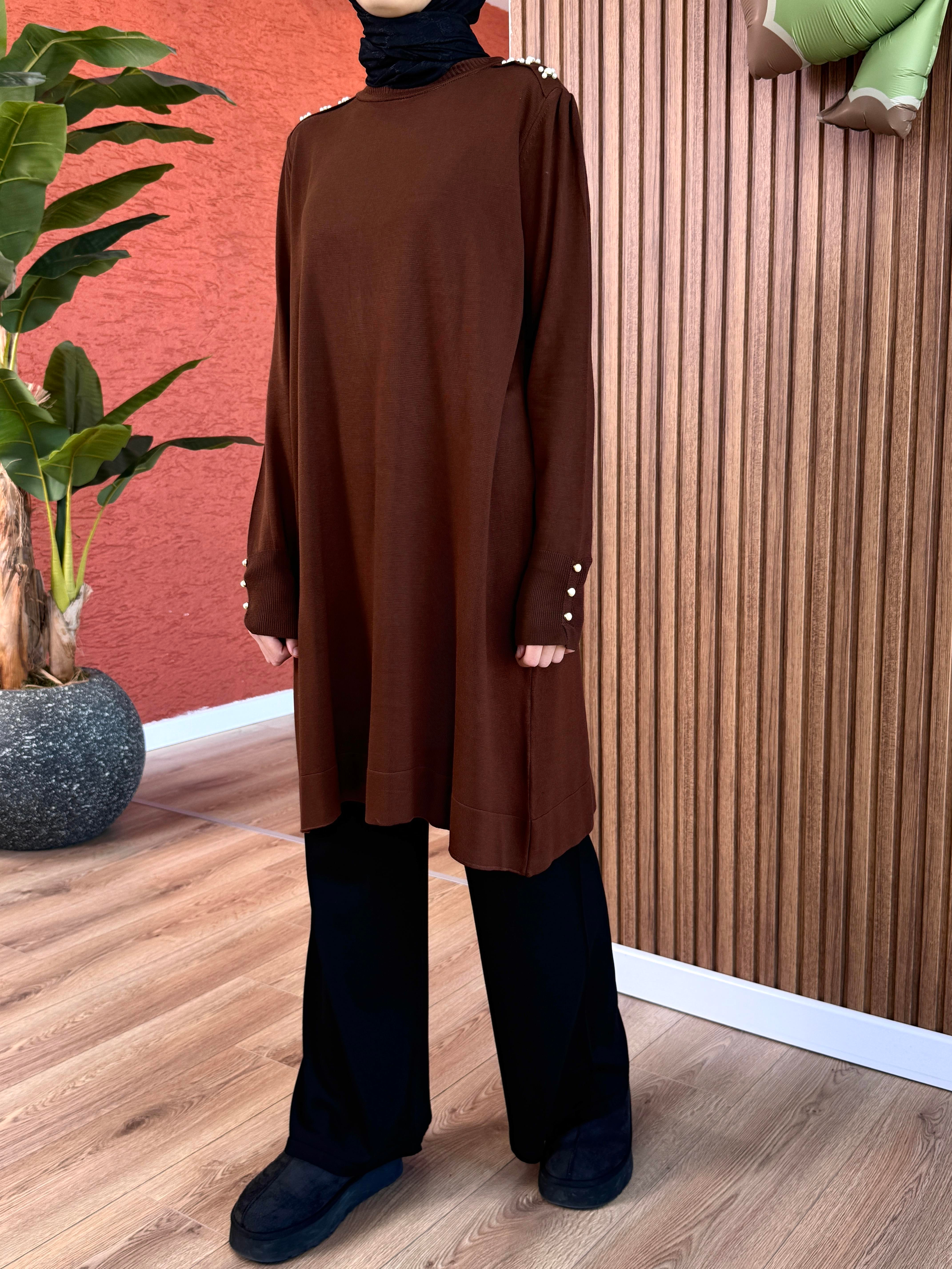 Kadın Soğuk İplik Merserize İnci Detaylı Tunik- Kahve (Q195)