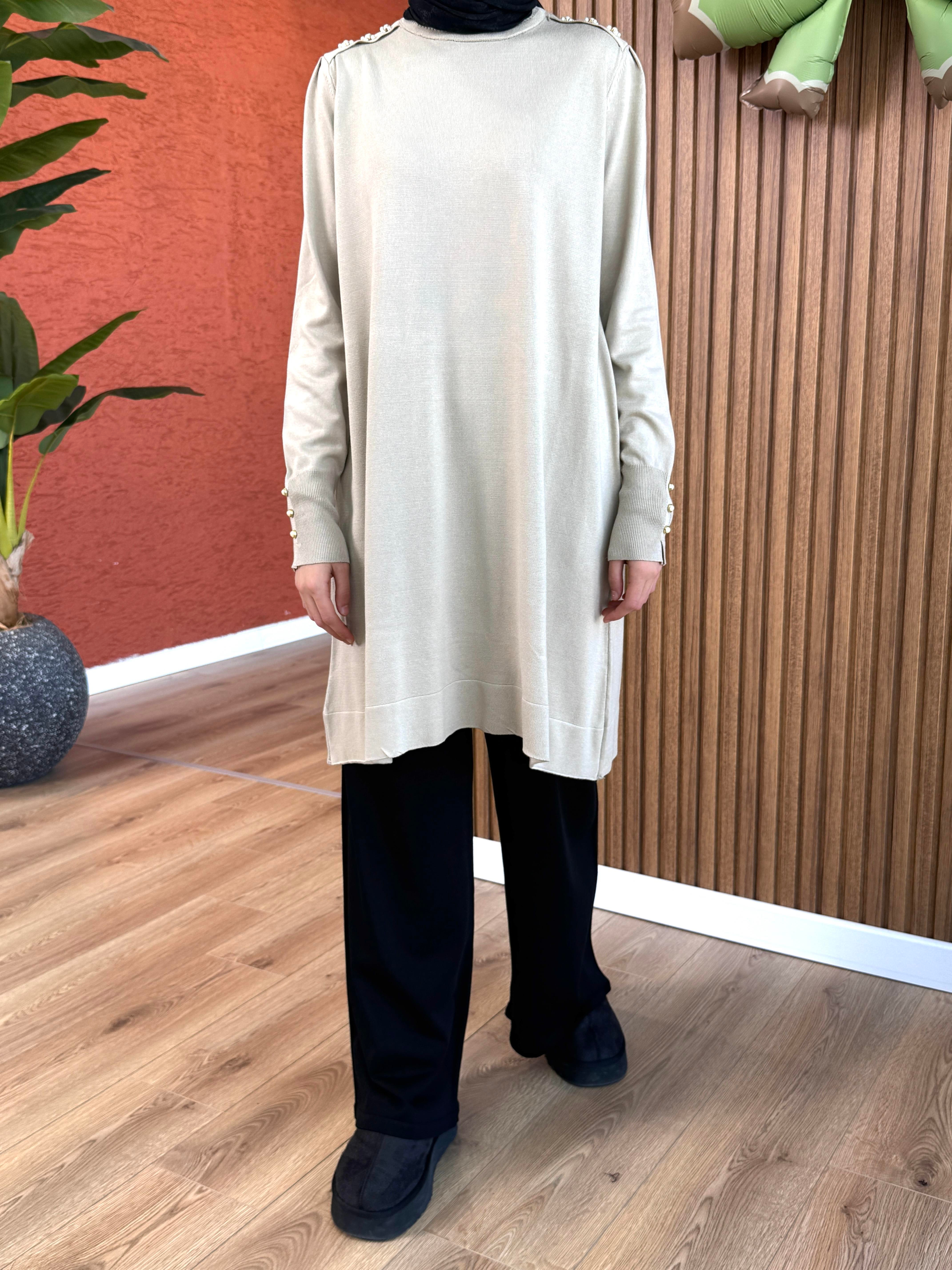 Kadın Soğuk İplik Merserize İnci Detaylı Tunik- Krem (Q195)
