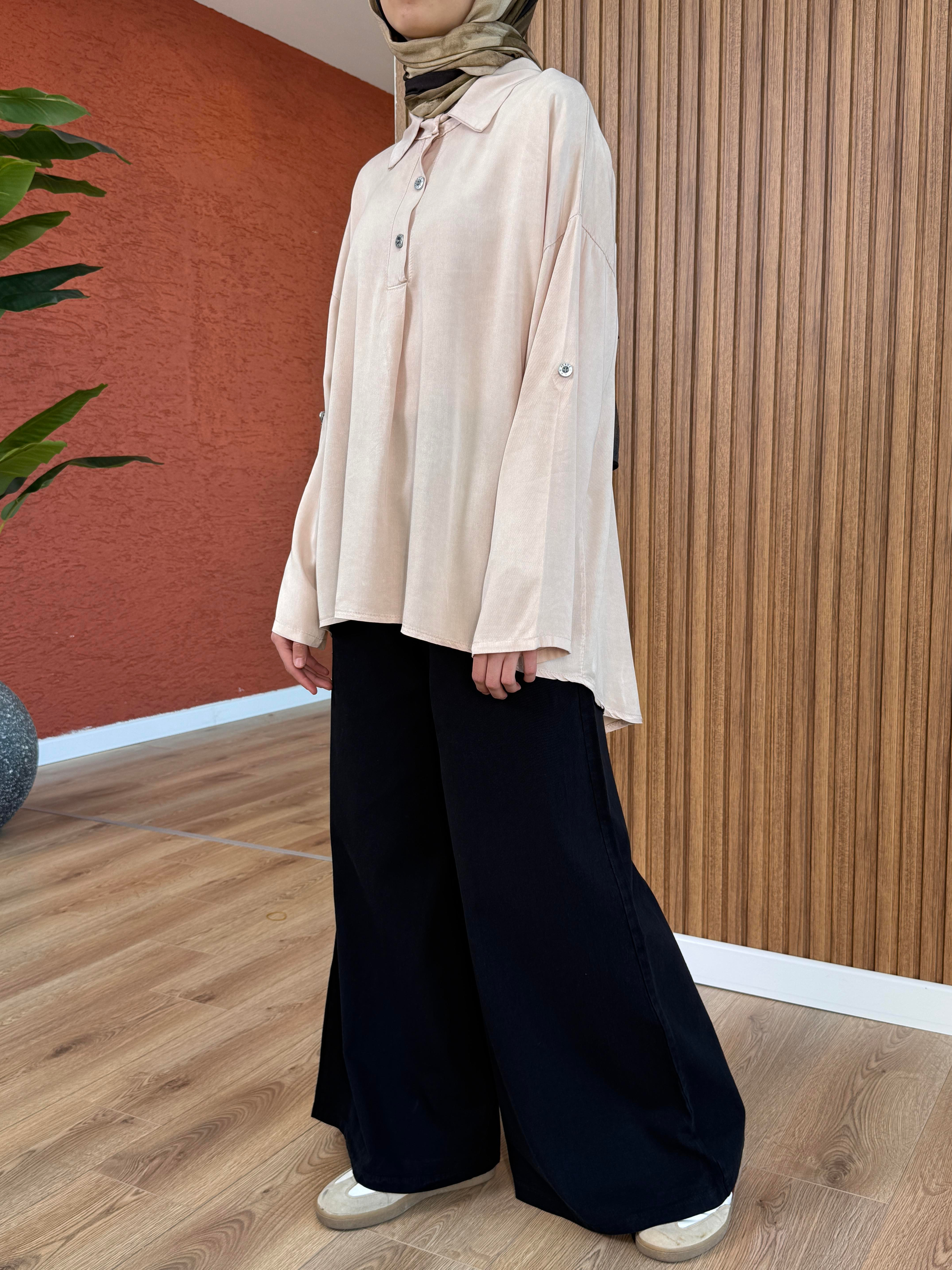 Kadın Tencel Kumaş Tunik-Krem (Q193)