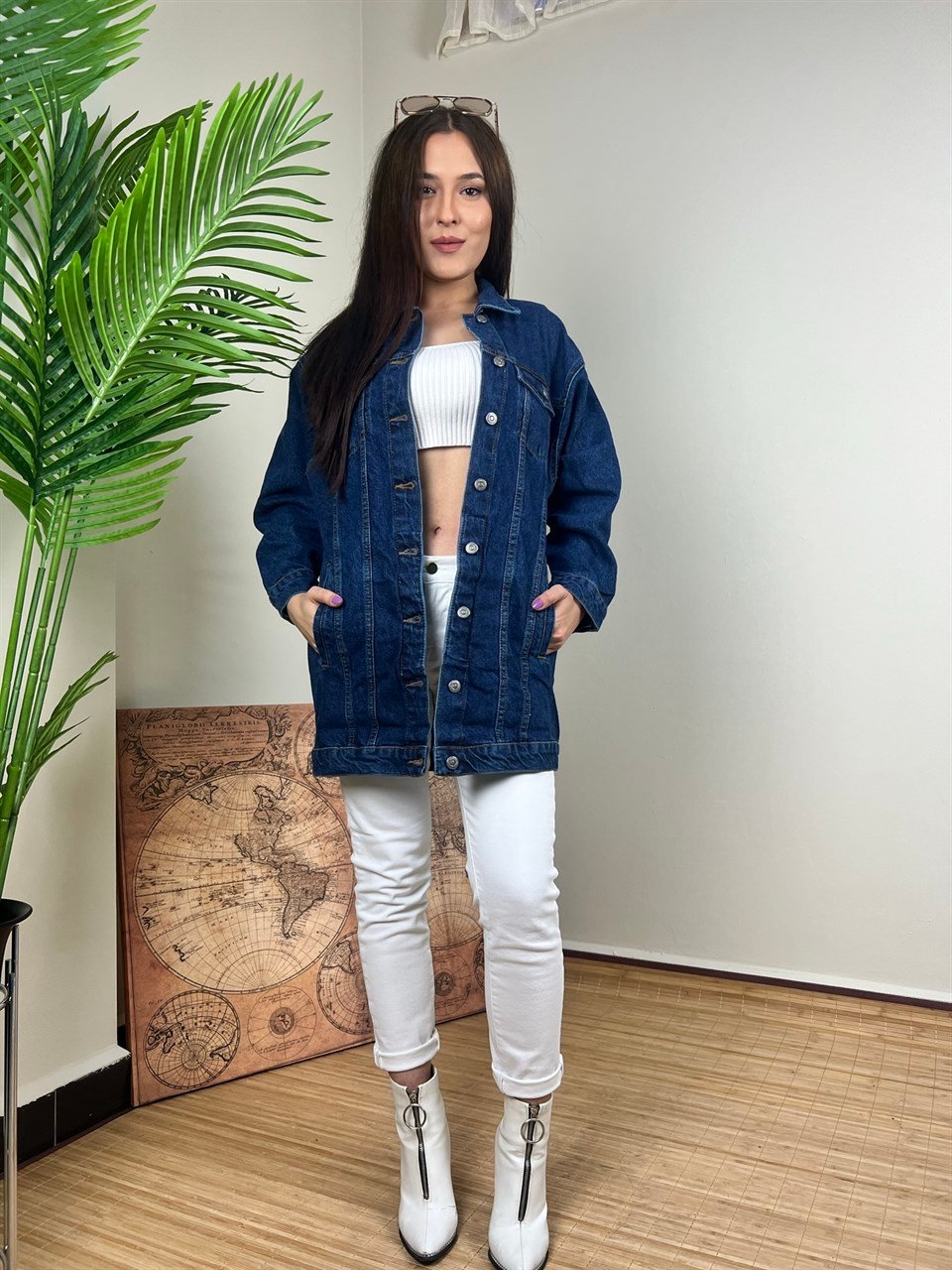 QASHMİR KADIN UZUN KOT CEKET - LACİVERT